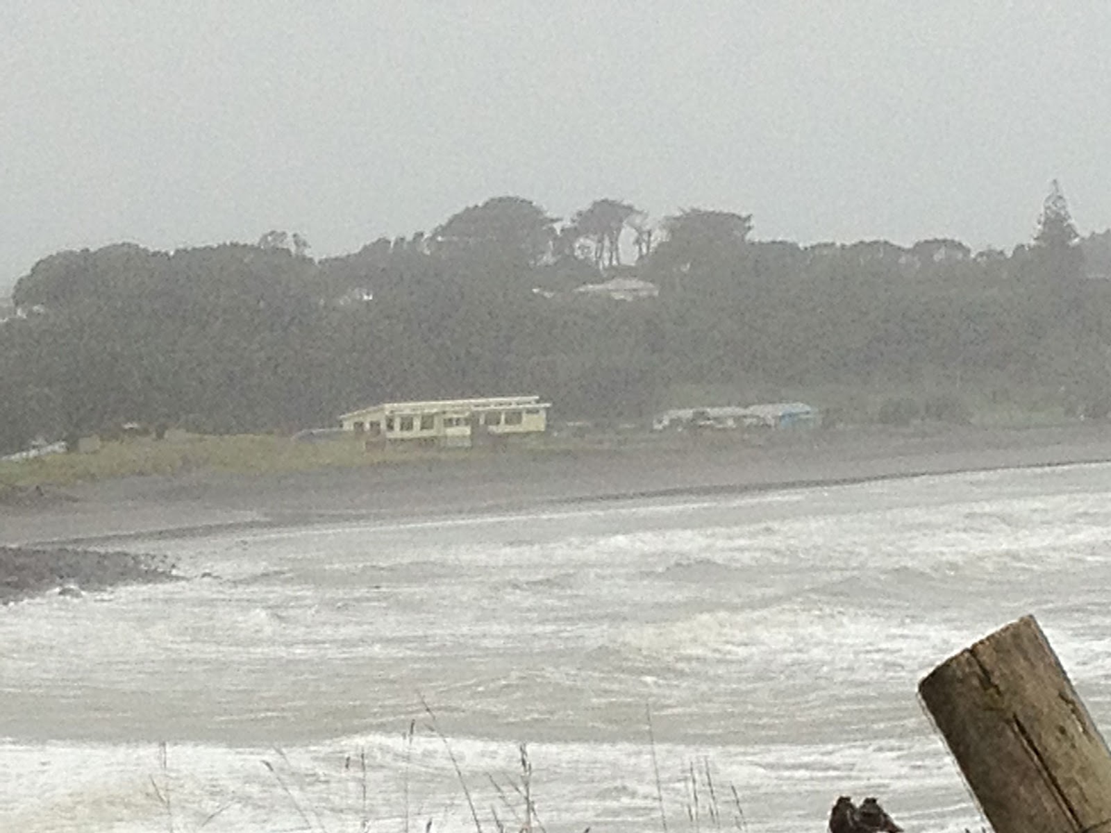 The airborne spray obscuring the shot of Opunake Main Beach form the clifftop